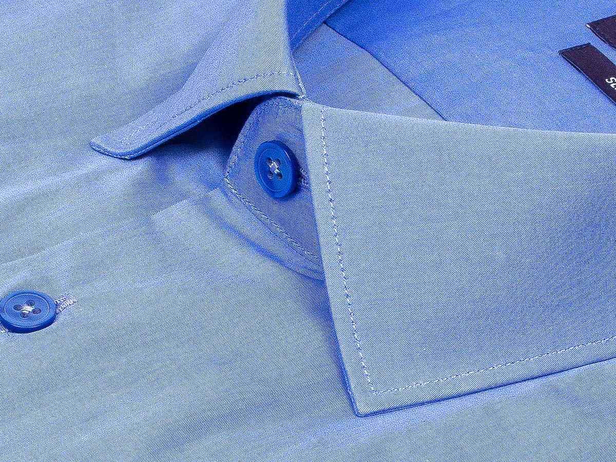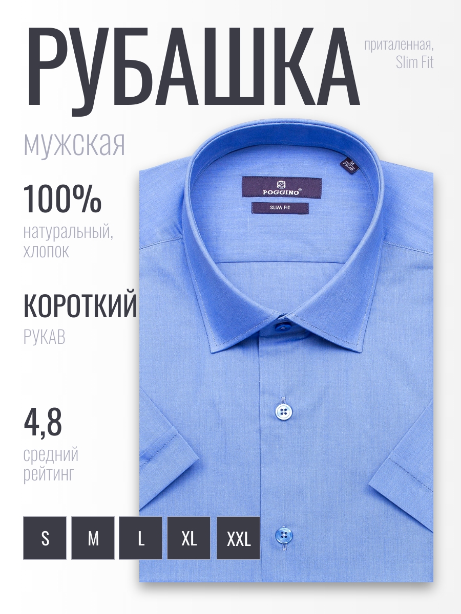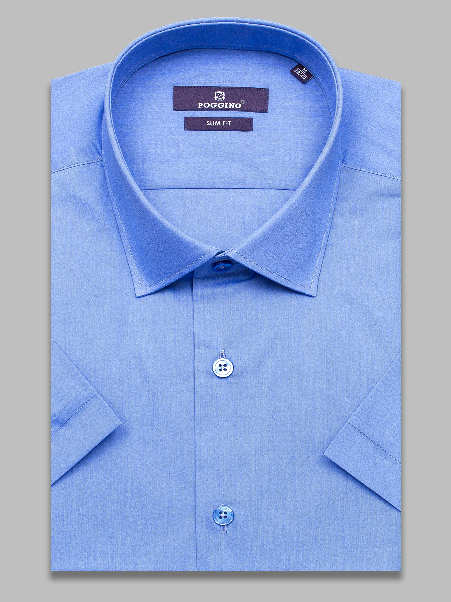 Приталенная мужская рубашка Poggino 7005-07 синего цвета с коротким рукавом и классическим воротником из 100% хлопковой ткани.