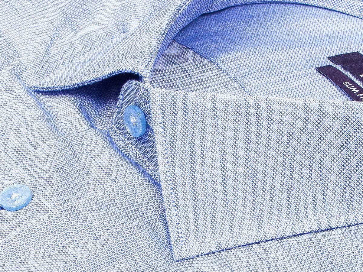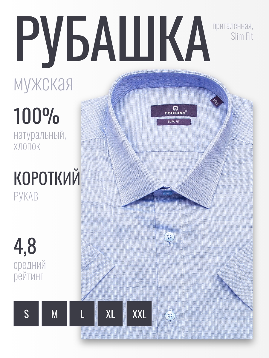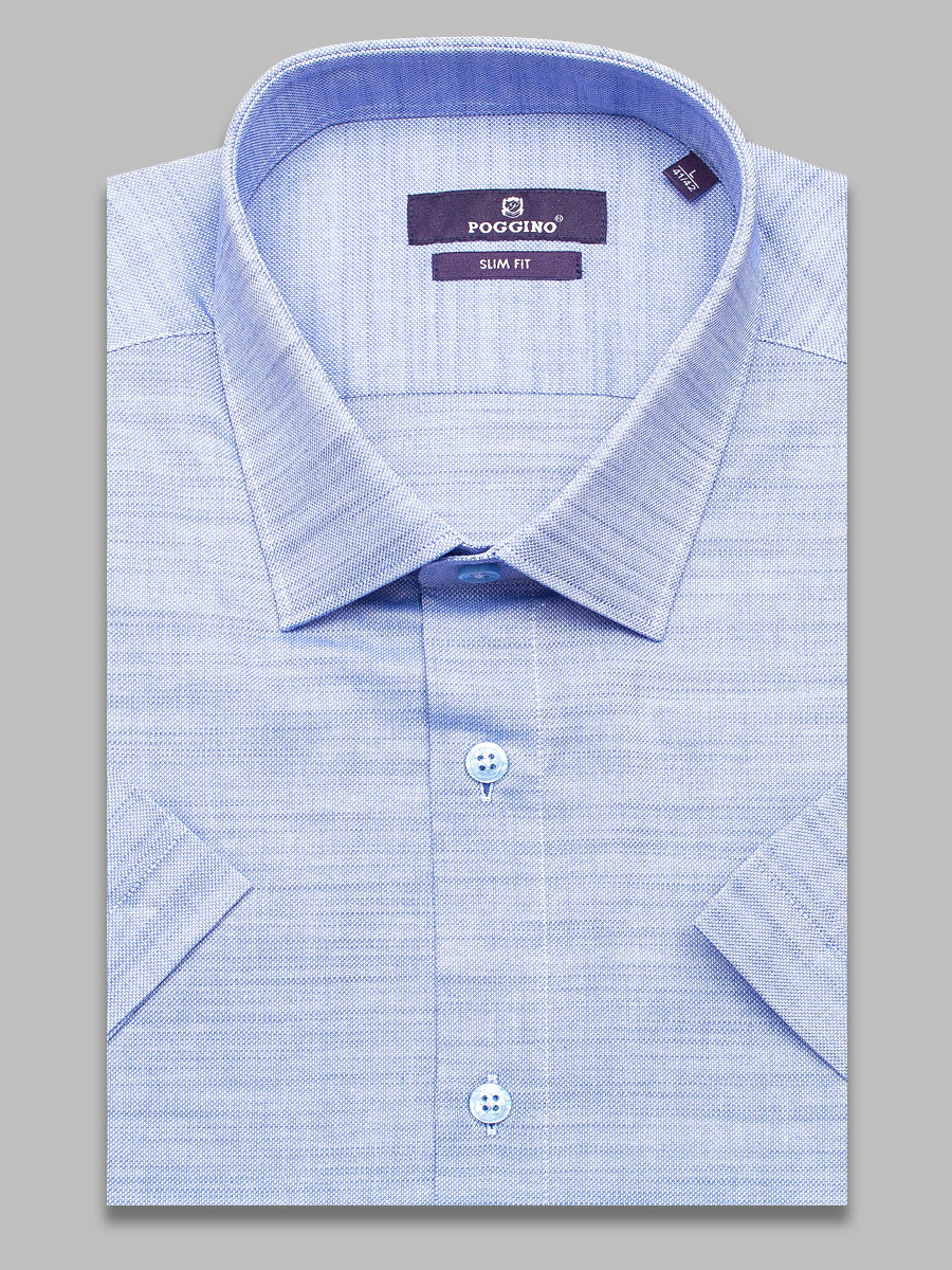 Приталенная мужская рубашка Poggino 6000-49 светло-синего цвета меланж с классическим воротником и короткими рукавами из натуральной 100% хлопковой ткани.