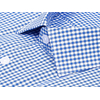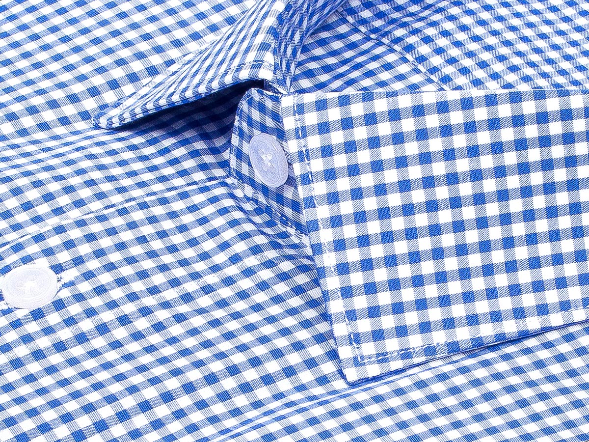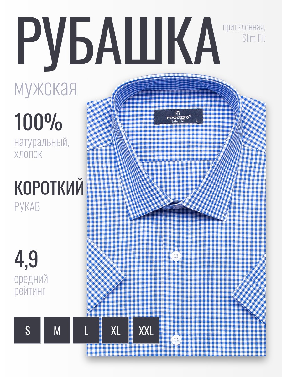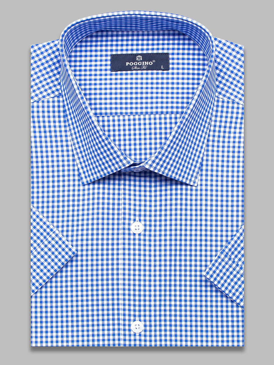 Приталенная мужская рубашка Poggino 6000-12 синего цвета в клетку с коротким рукавом и классическим воротником из натуральной 100% хлопковой ткани.