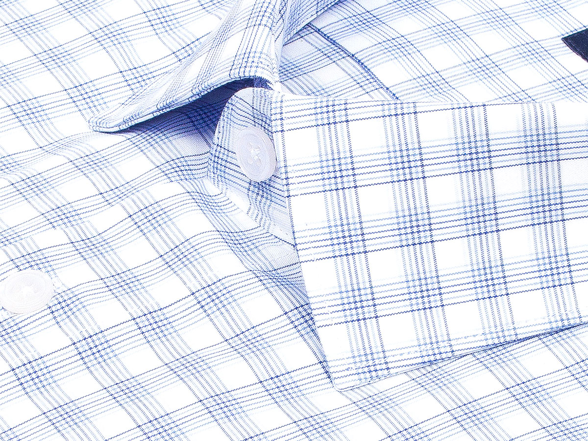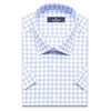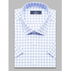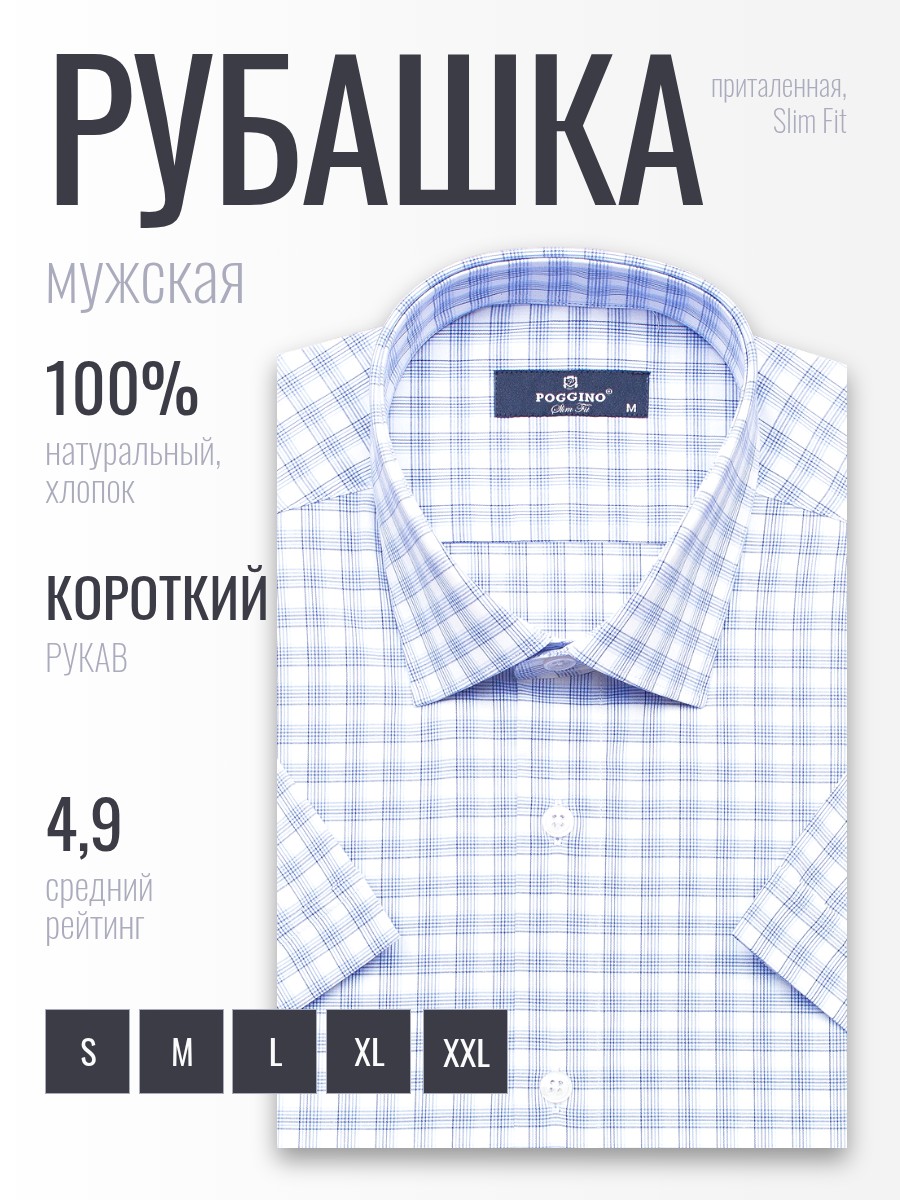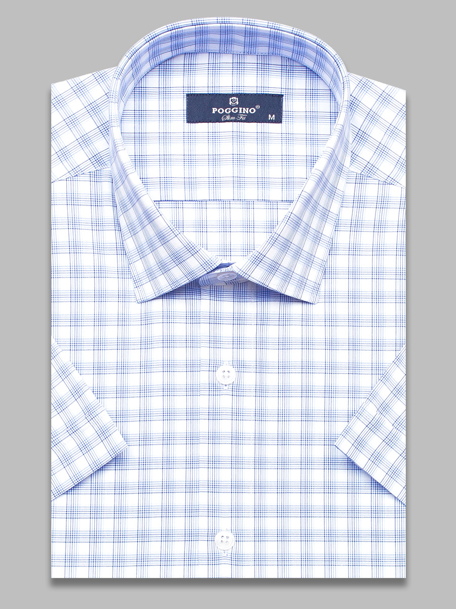 Приталенная мужская рубашка Poggino 6000-04 голубого цвета в клетку с коротким рукавом и классическим воротником из натуральной 100% хлопковой ткани.
