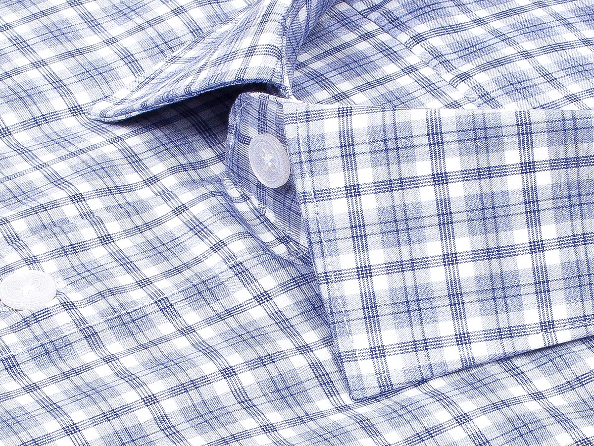 Синий цвет рубашки подойдет для создания различных образов, а клетка добавит оригинальности.