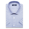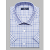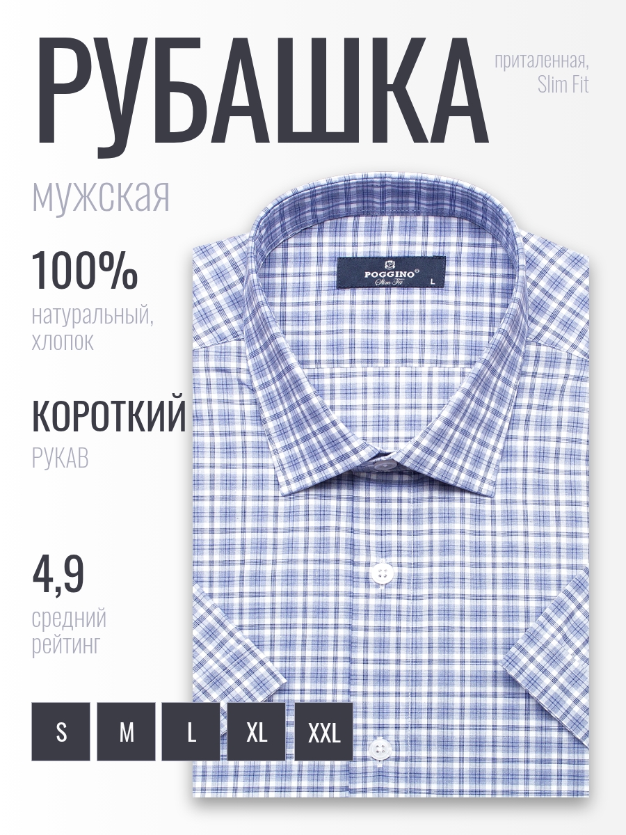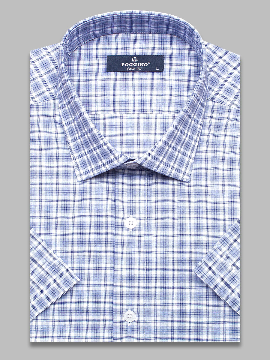 Приталенная мужская рубашка Poggino 6000-05 синего цвета в клетку с коротким рукавом и классическим воротником из натуральной 100% хлопковой ткани.