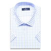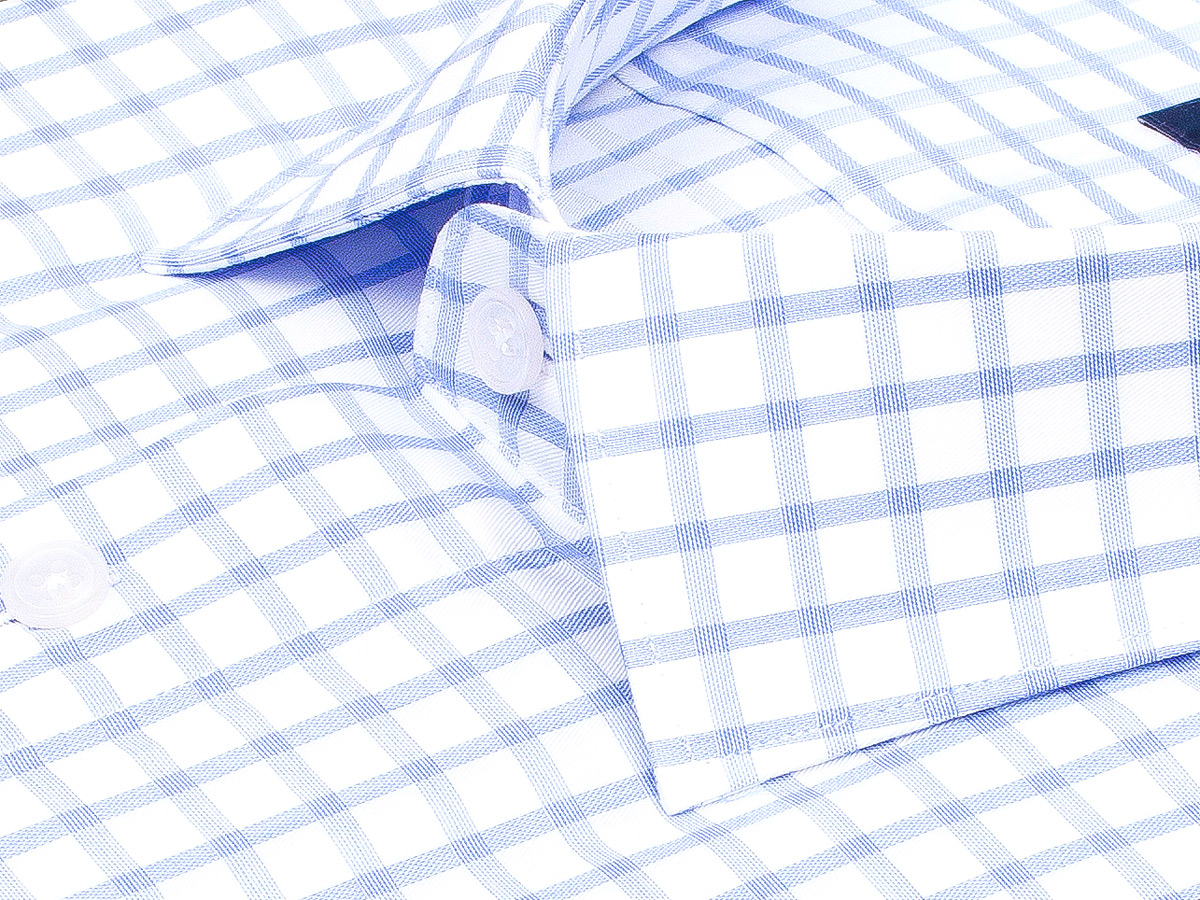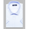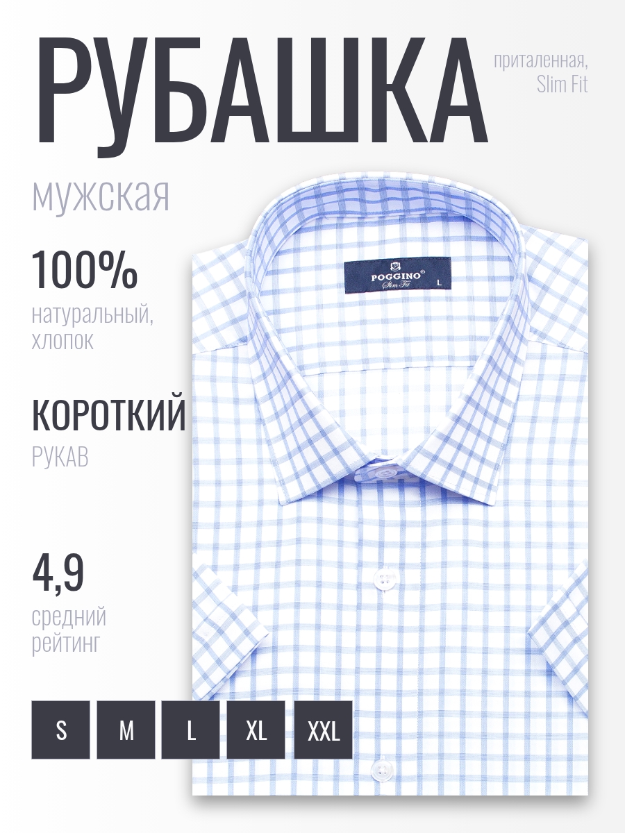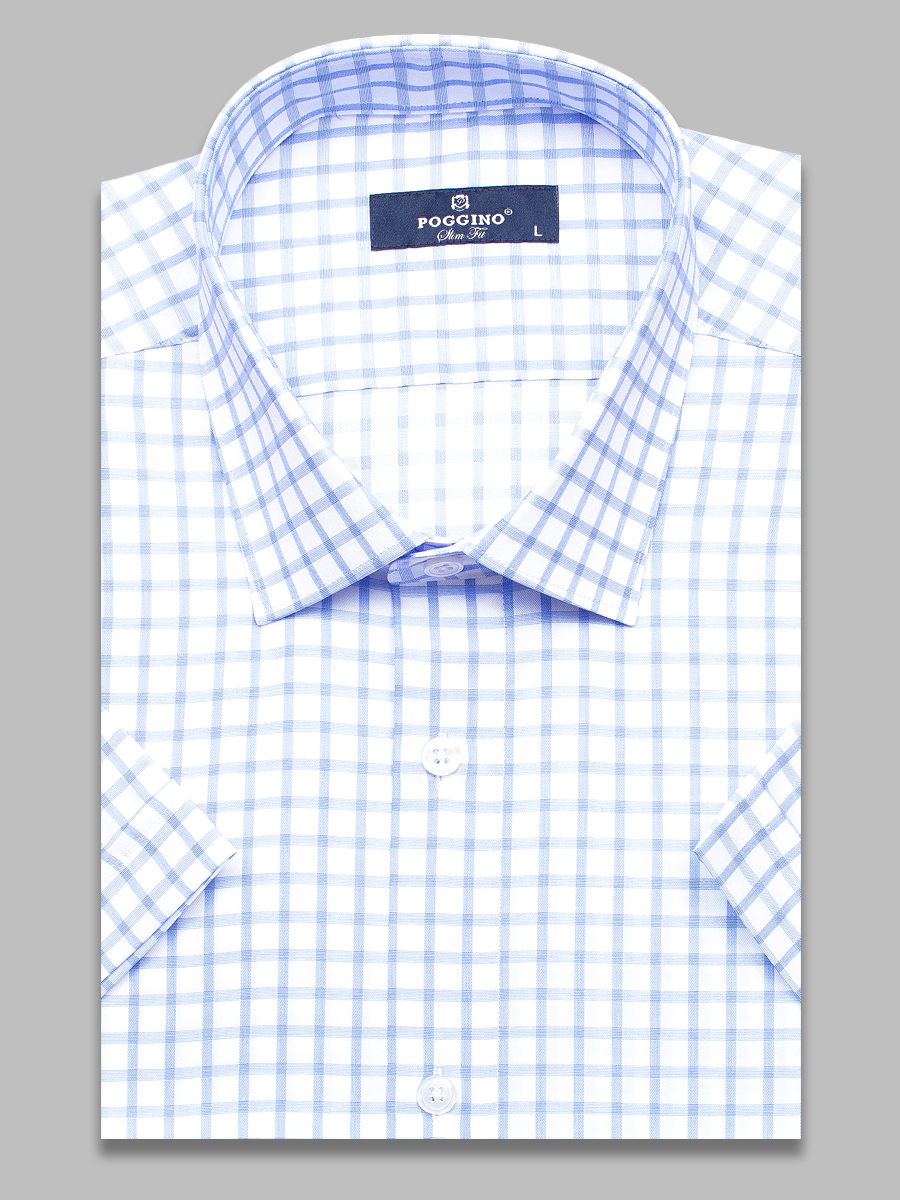 Приталенная мужская рубашка Poggino 6000-01 голубого цвета в клетку с коротким рукавом и классическим воротником из натуральной 100% хлопковой ткани.