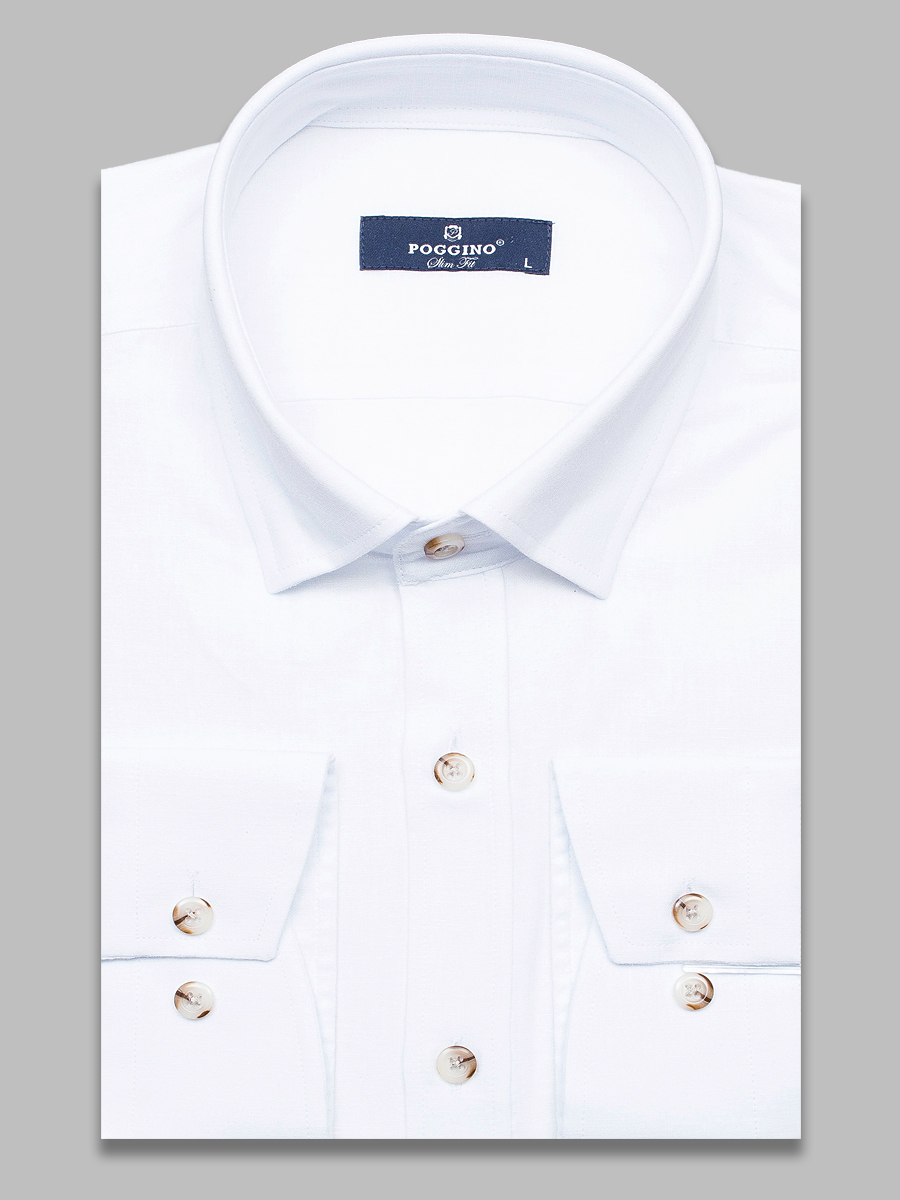 Льняная белая приталенная мужская рубашка с длинным рукавом