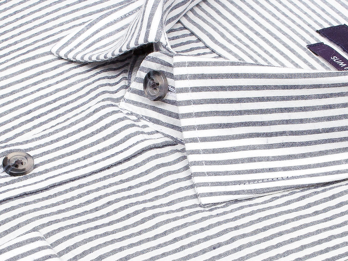Приталенная мужская рубашка Poggino 2000-22 серого цвета в полоску с длинными рукавами и воротником баттен-даун выполнена из 100% натуральной льняной ткани.