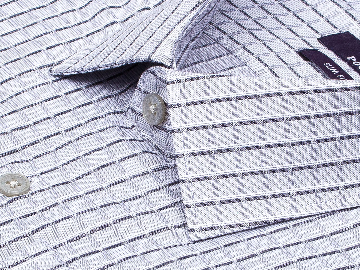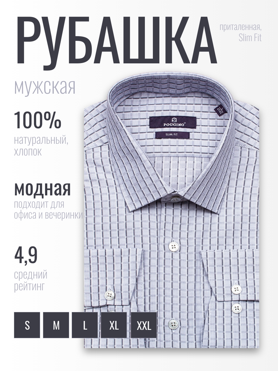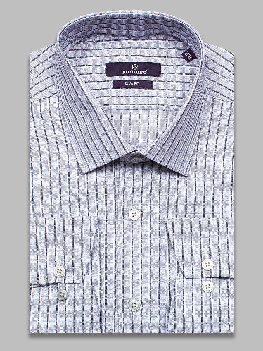 Приталенная мужская рубашка Poggino 7020-33 серого цвета в клетку с длинными рукавами и классическим воротником из натуральной 100% хлопковой ткани.