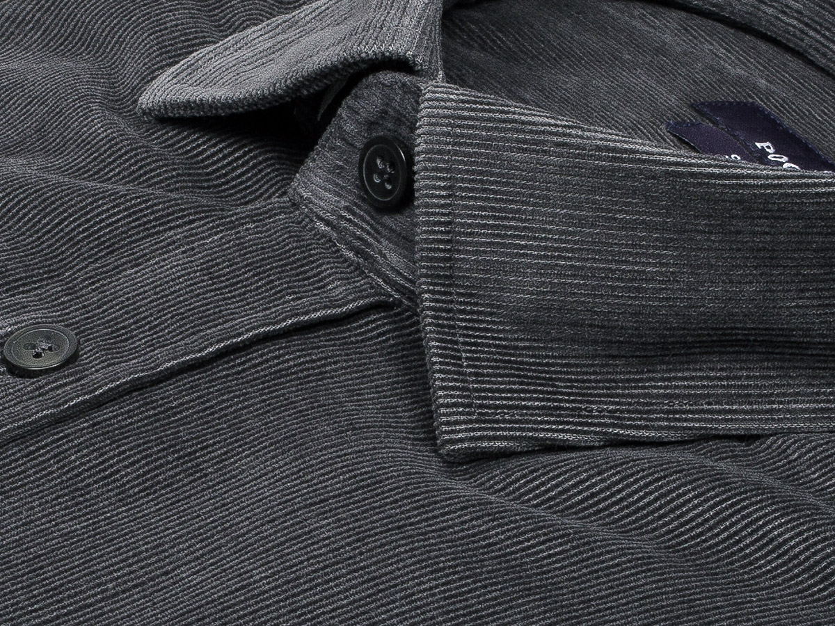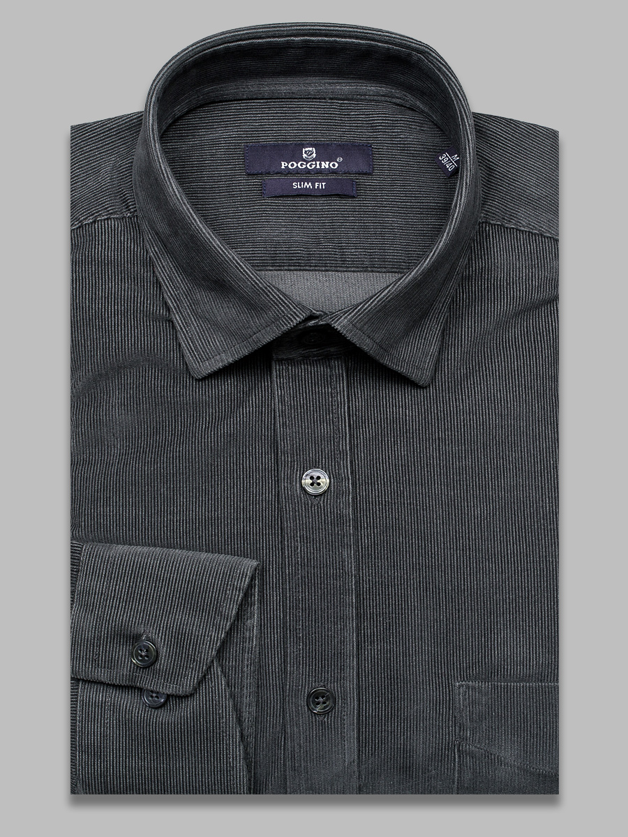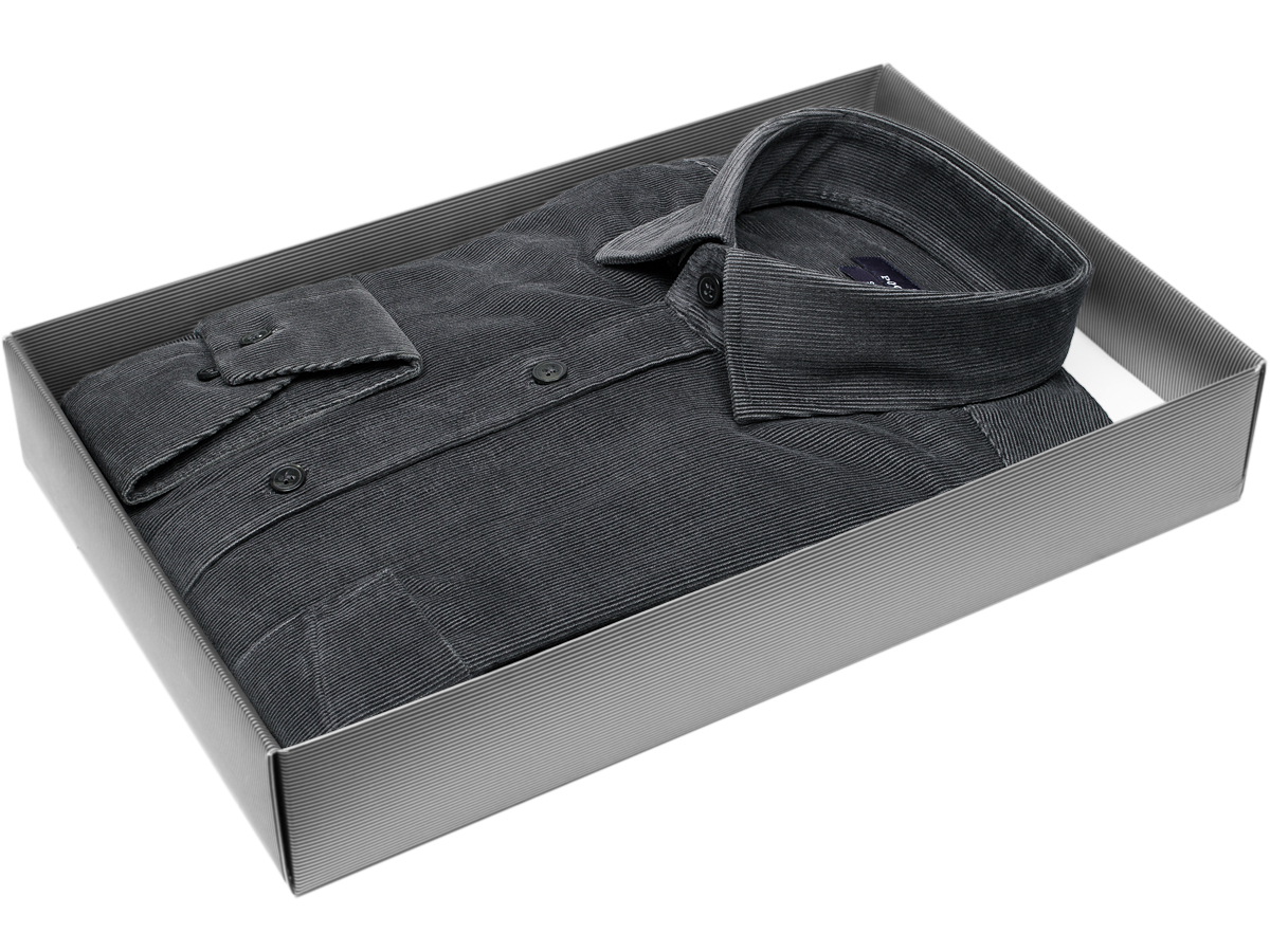 Серая вельветовая приталенная рубашка с длинными рукавами