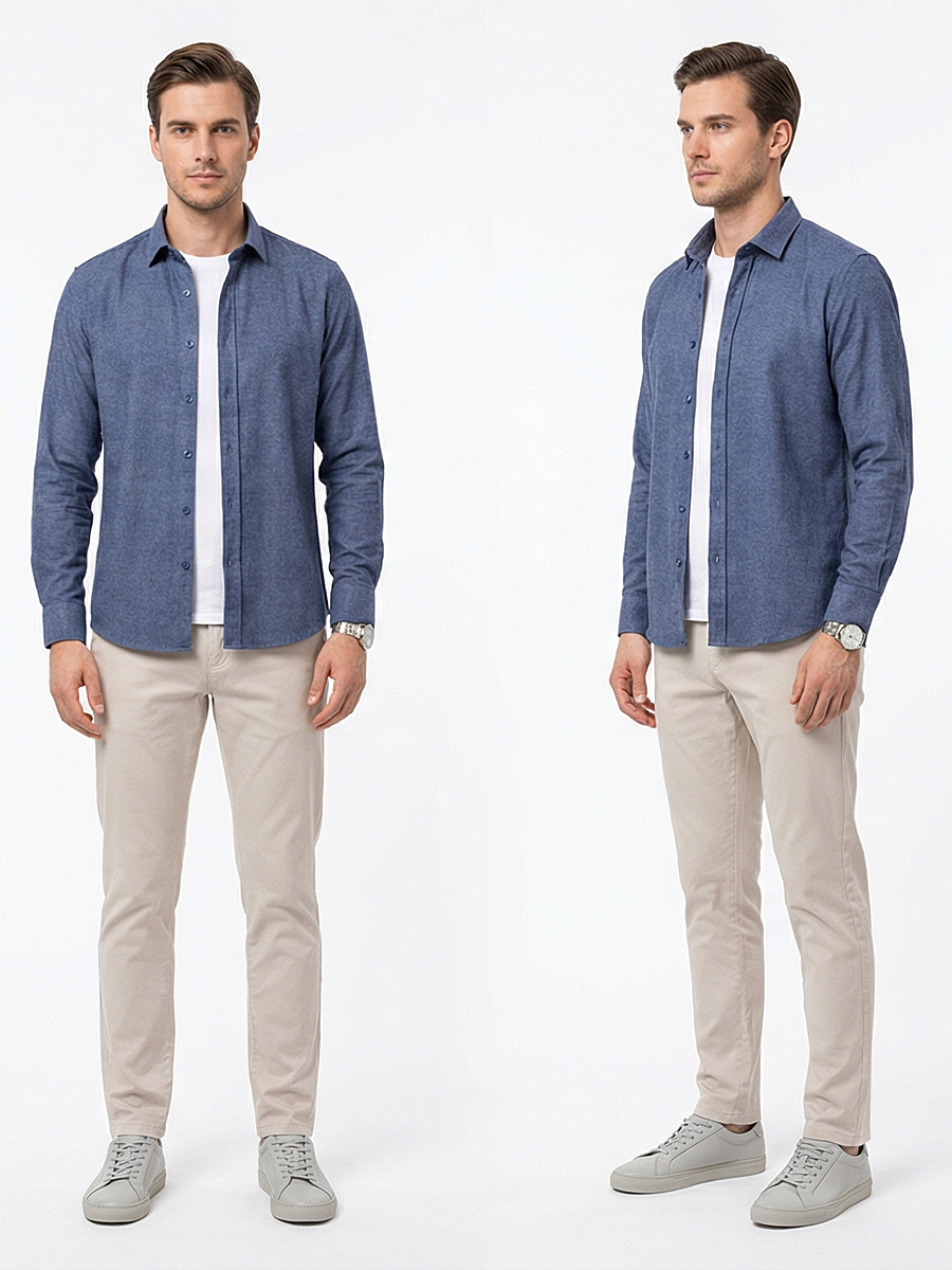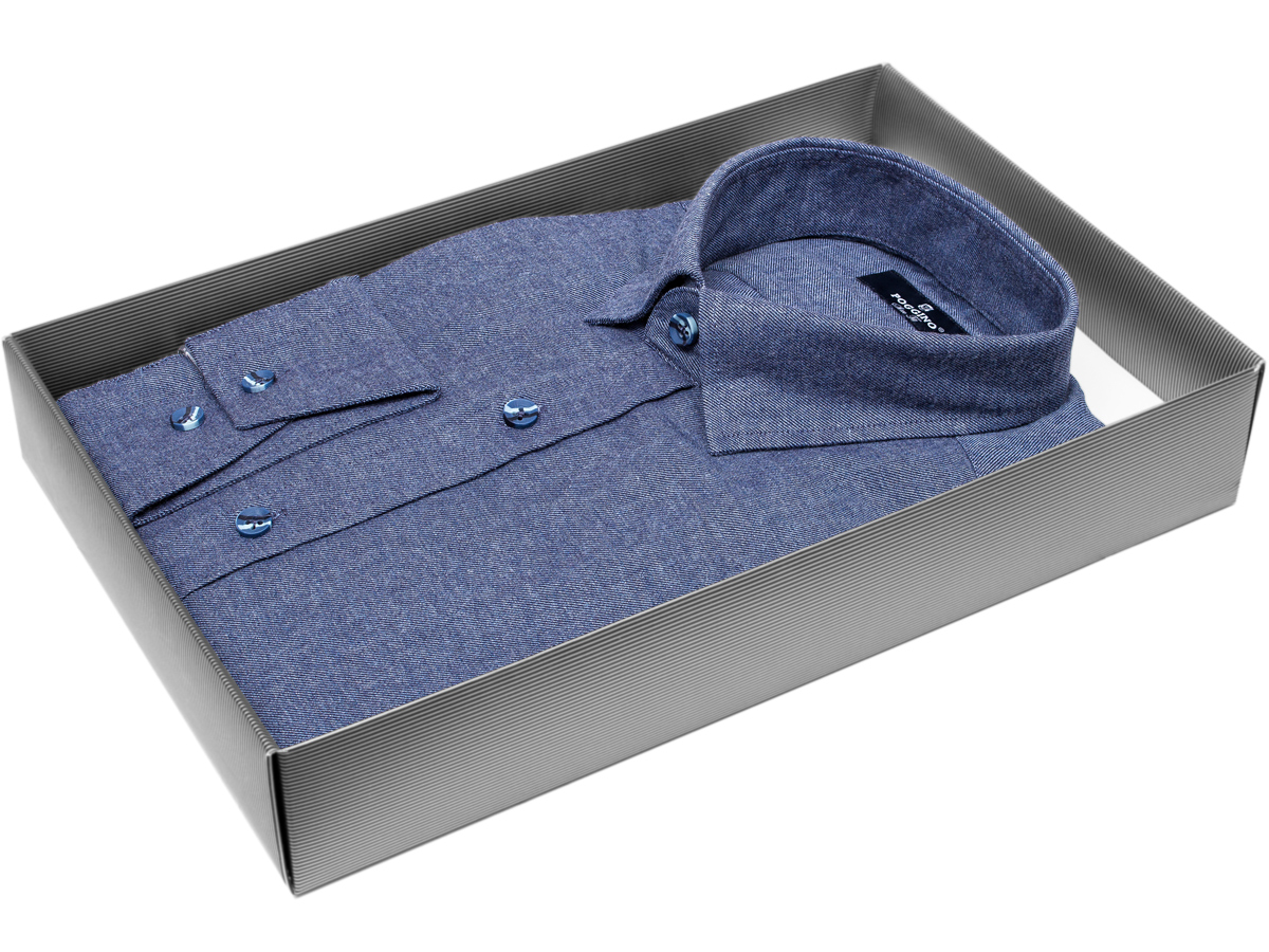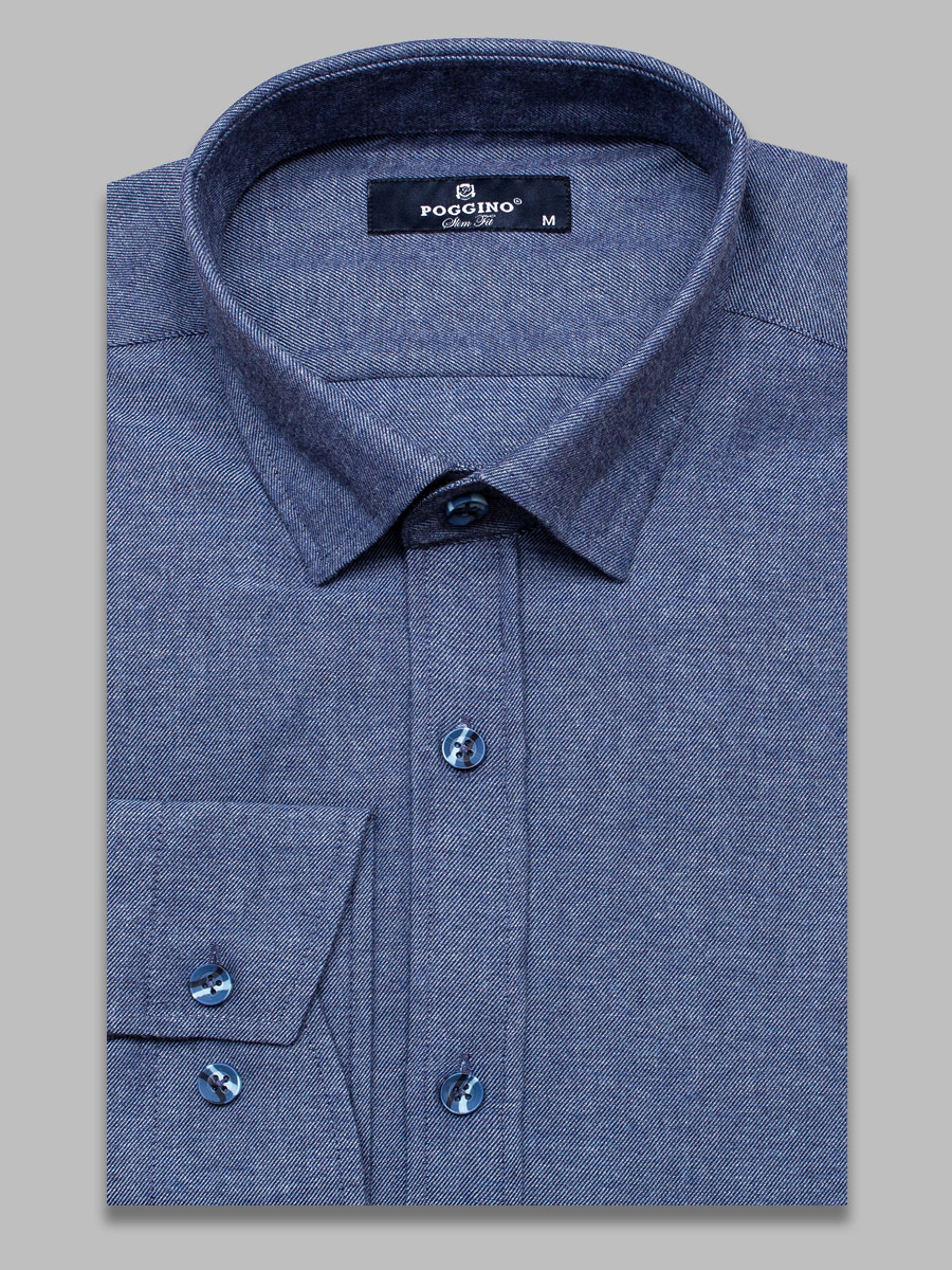 Байковая приталенная мужская рубашка Poggino 4602-062 синего цвета меланж с классическим воротником и длинными рукавами из натуральной 100% хлопковой ткани.