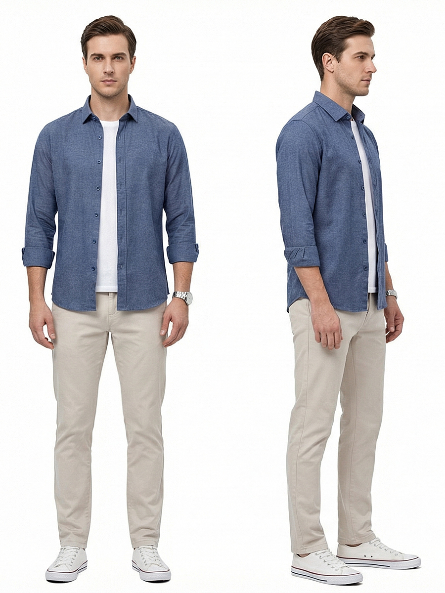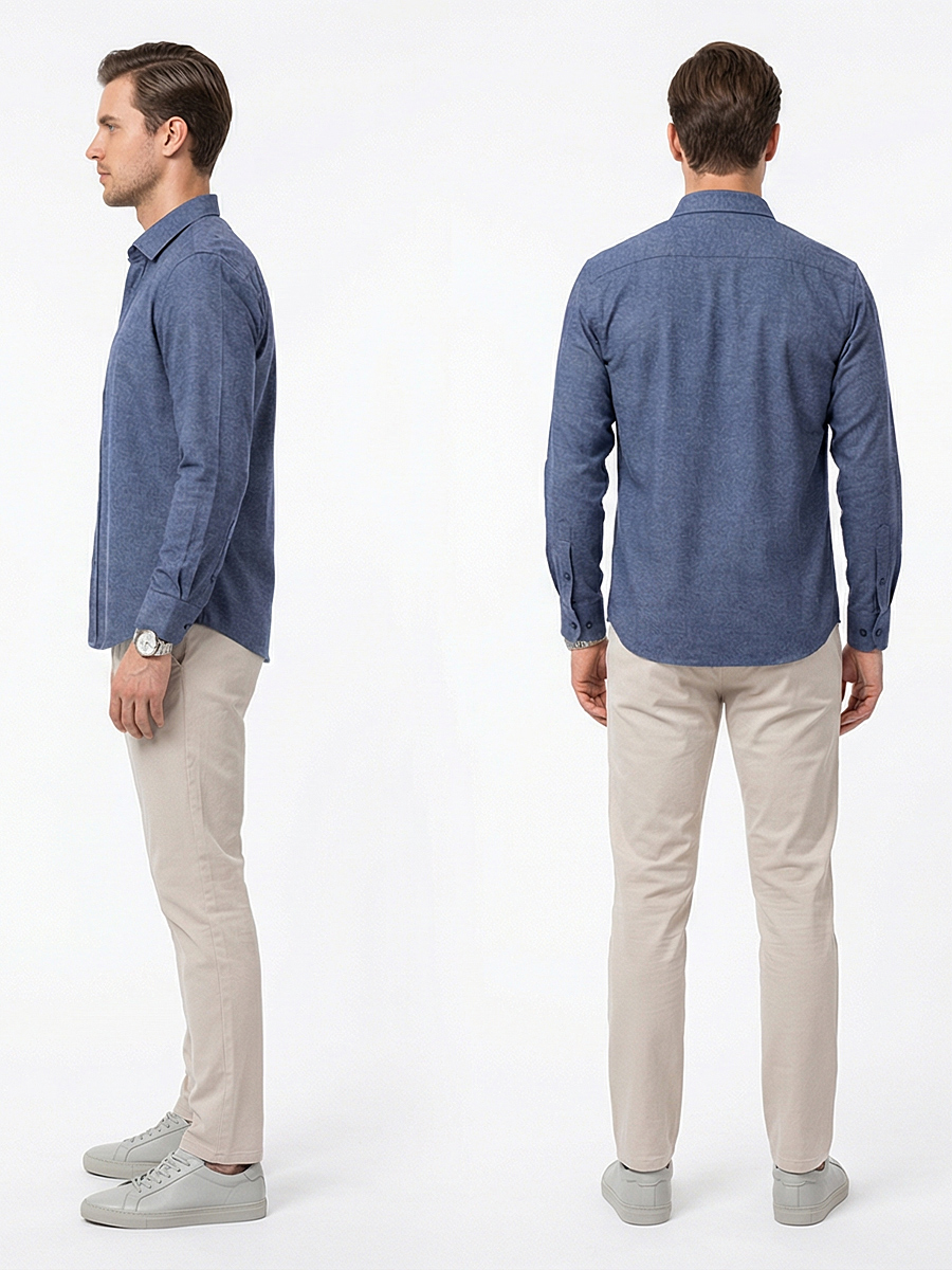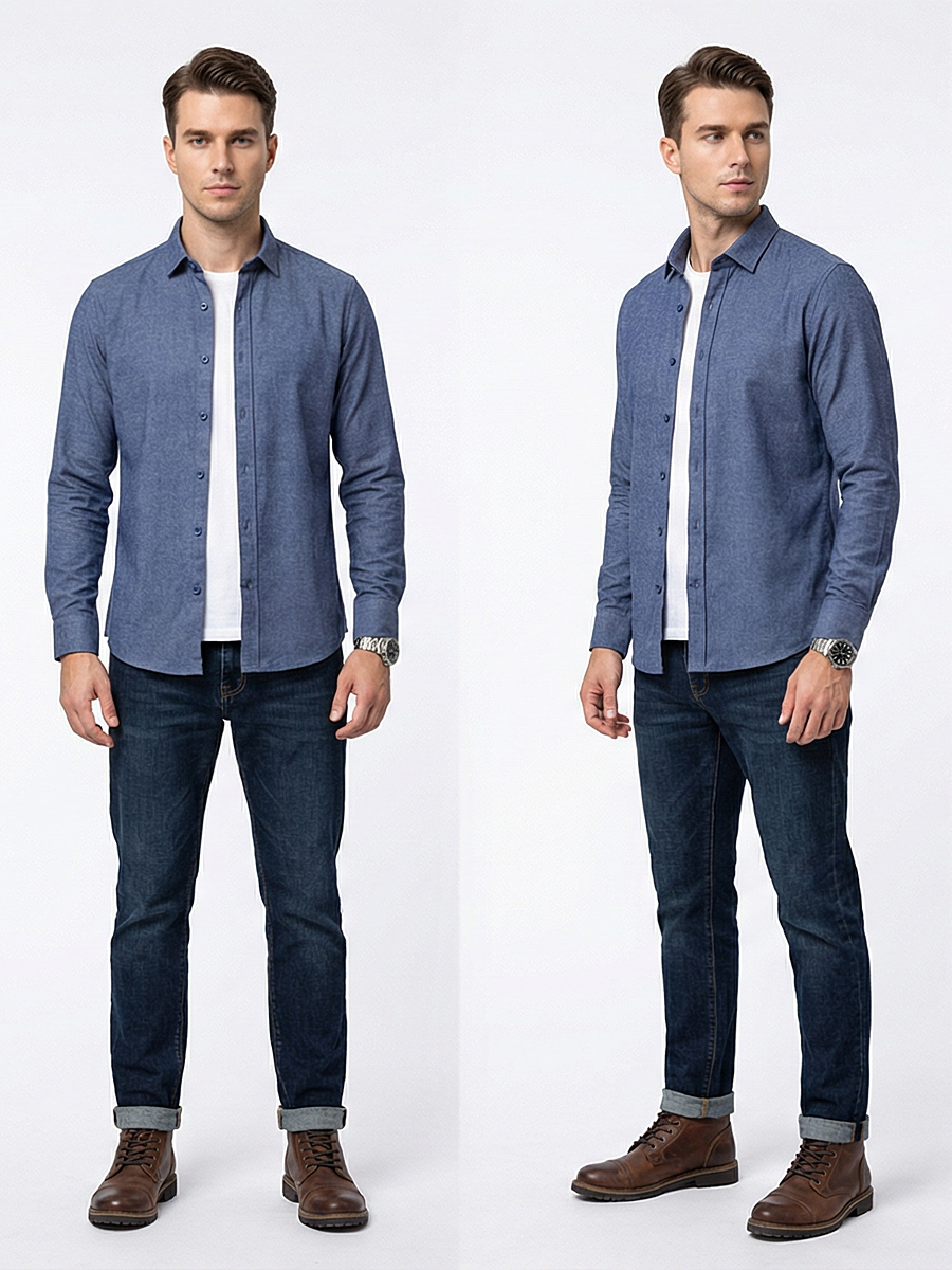 Байковая приталенная мужская рубашка Poggino 4602-062 синего цвета меланж с классическим воротником и длинными рукавами из натуральной 100% хлопковой ткани.