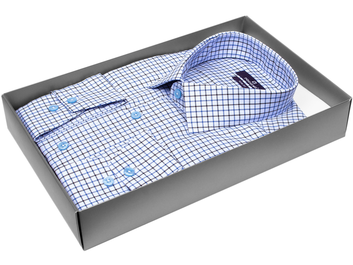 Голубая приталенная мужская рубашка Poggino 3300-09 Non Iron в клетку с длинными рукавами